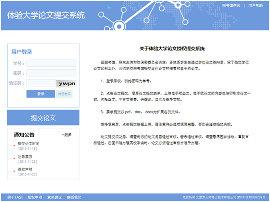 3、    授權模塊:取消了后臺的授權功能模塊,提前至學(xué)生提交論文環(huán)節。當學(xué)生第一次填寫(xiě)論文信息時(shí),系統會(huì )詢(xún)問(wèn)學(xué)生是否將論文授權給學(xué)校保留及使用等相關(guān)權限。